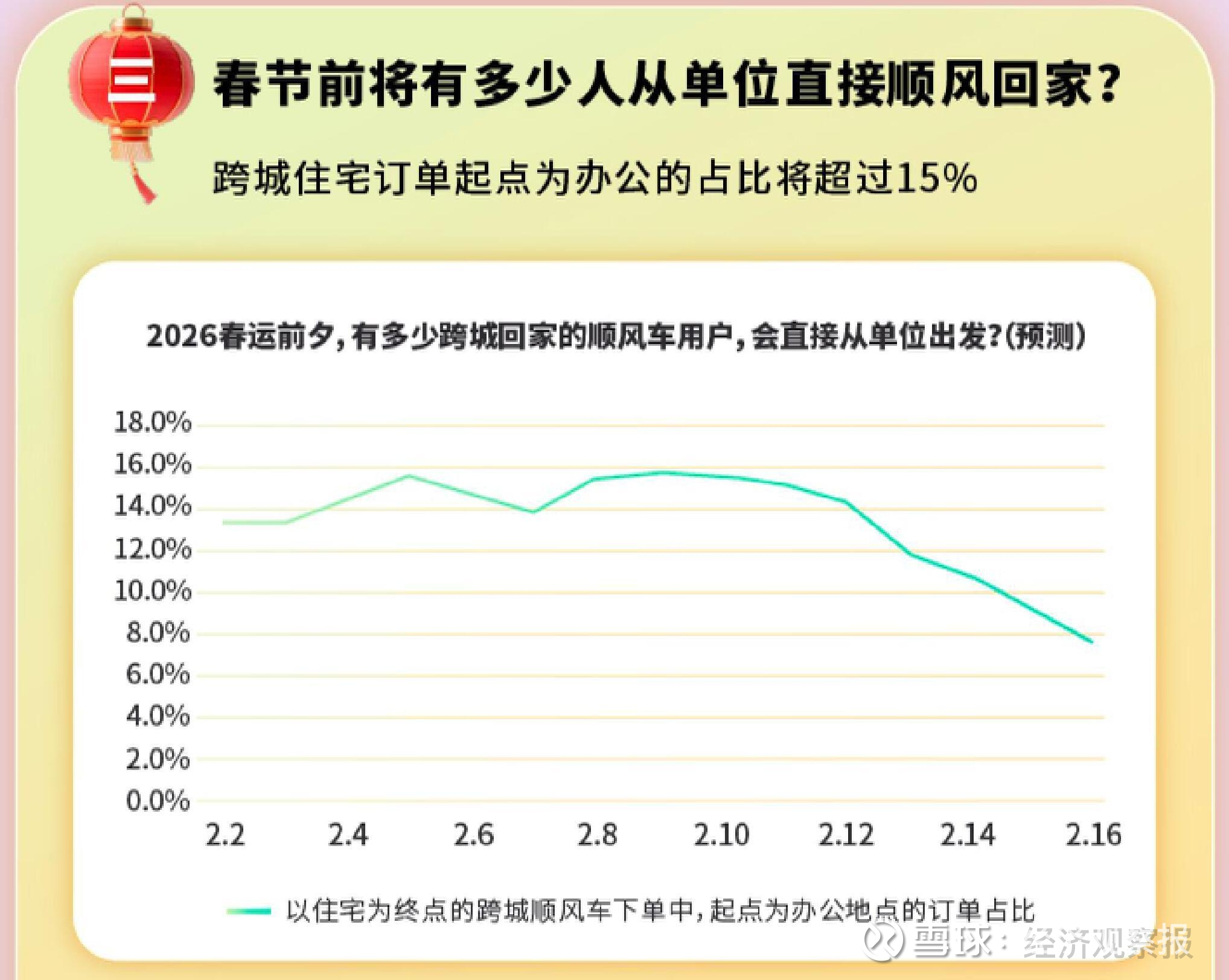 此外,今年春节前夕,在以住宅为终点的跨城顺风车下单中,预计将有超15%是直接从单位出发,一站直达到家。顺风车让春节前还在坚守岗位的上班族,回家更省心和高效。