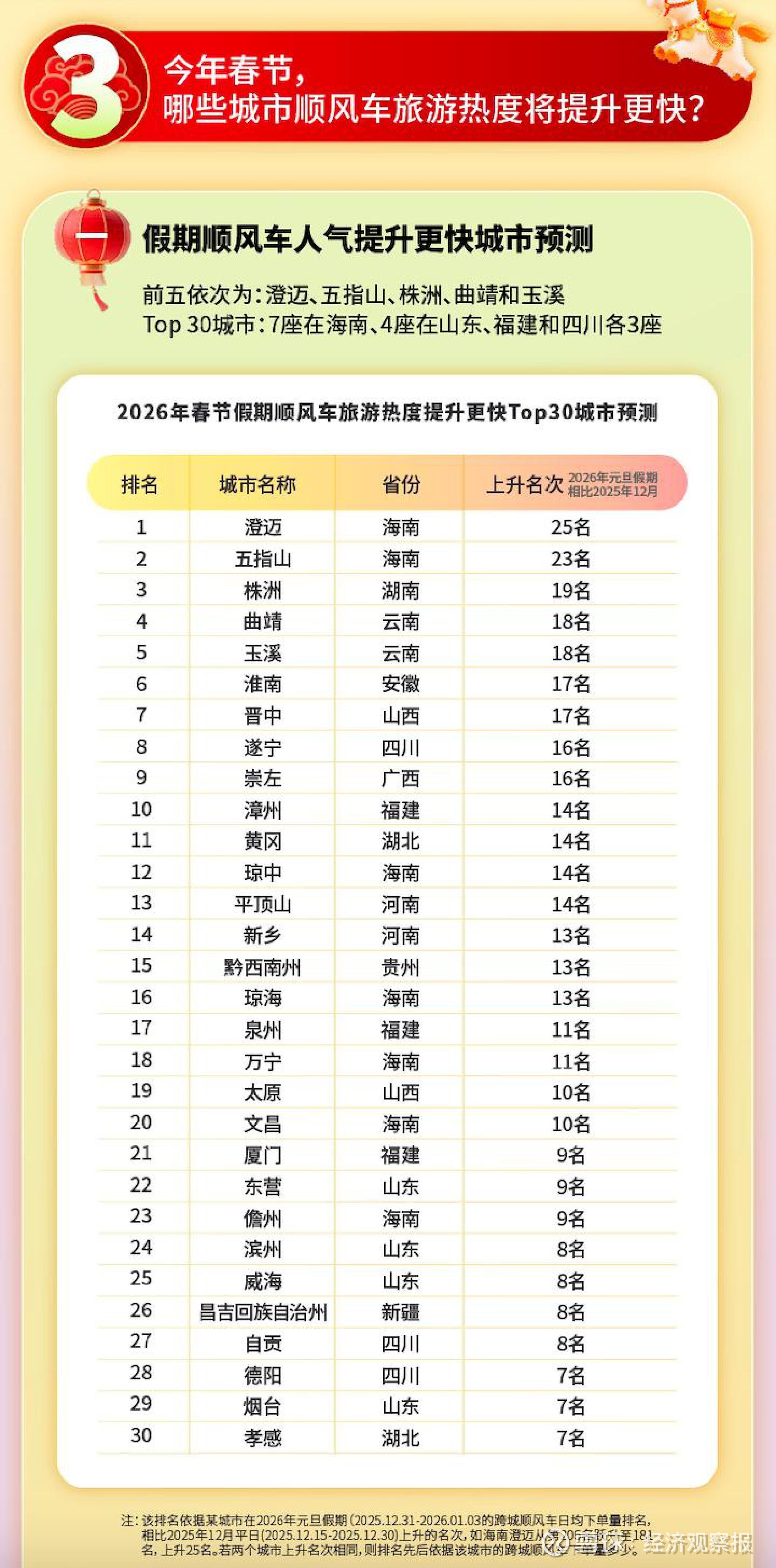 《预测》显示今年春节期间,旅游热度有望提升最快的城市Top10,预计将包括澄迈、五指山、株洲,曲靖、玉溪、淮南、晋中、遂宁、崇左和漳州。