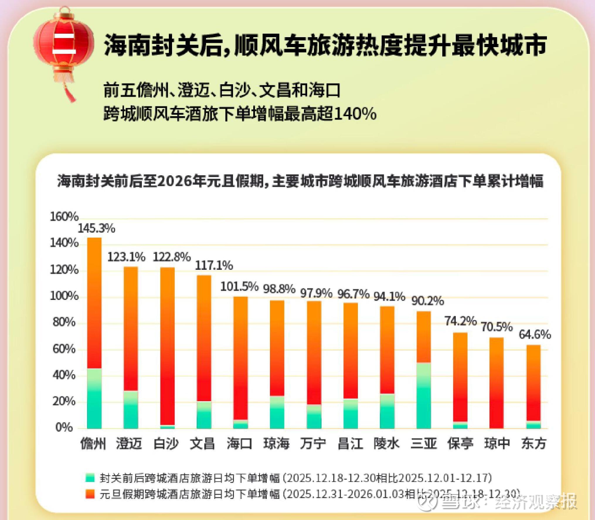 同时,海南省去年封关后,多城的跨城顺风车旅游热度均大幅增长,如儋州自2025年12曰18日至今,跨城顺风车酒旅下单累计增幅已超145%。