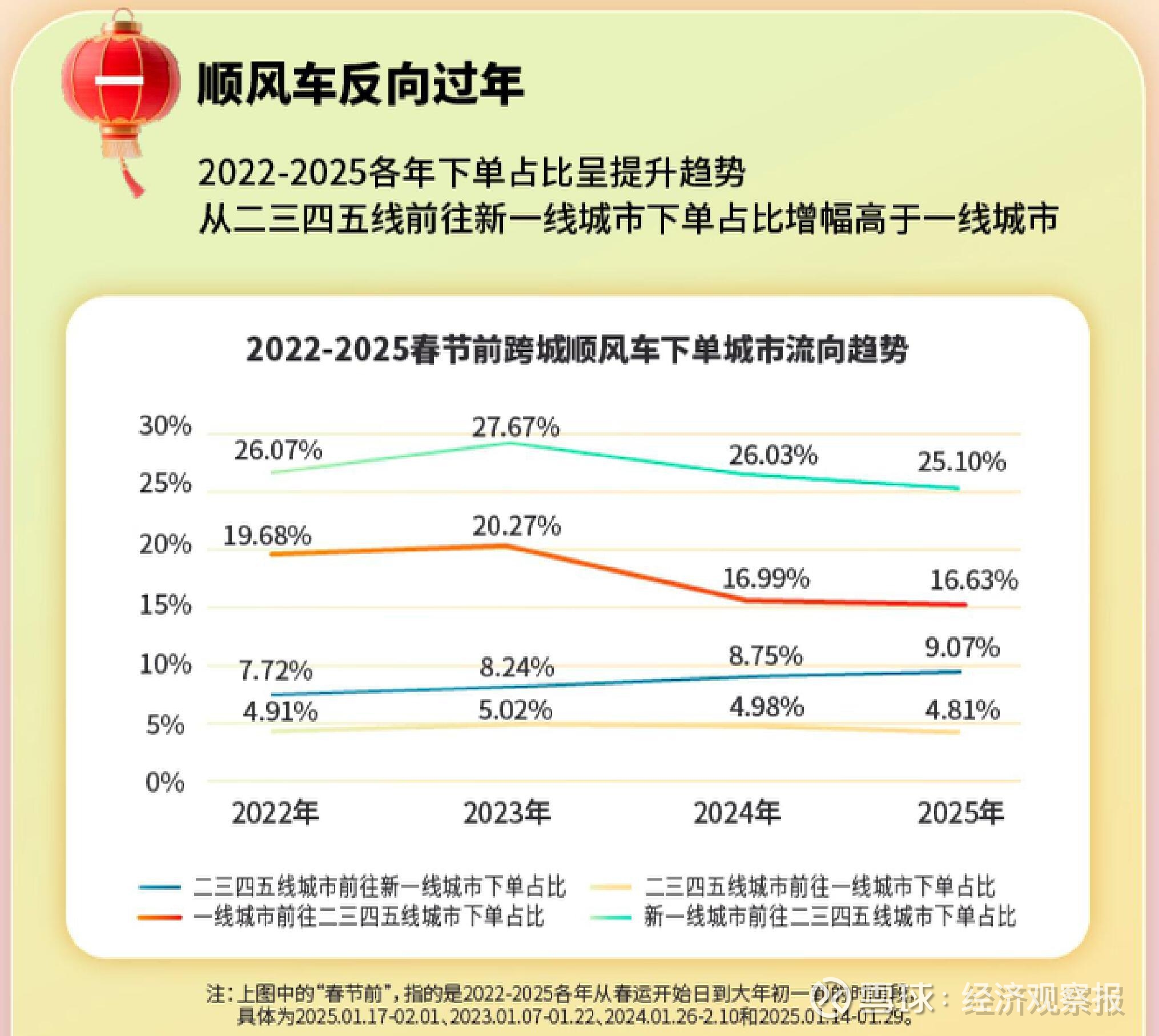 从2022年至2025年,各年春节前的跨城顺风车城市流向来看,从一线新一线城市分别前往二、三、四、五、线城市的下单量占比,整体均呈下降趋势,且一线城市前往二三四五线城市下单占比降幅更明显,从2022年的19.68%降至2025年的16.63%,下降超3个百分点。