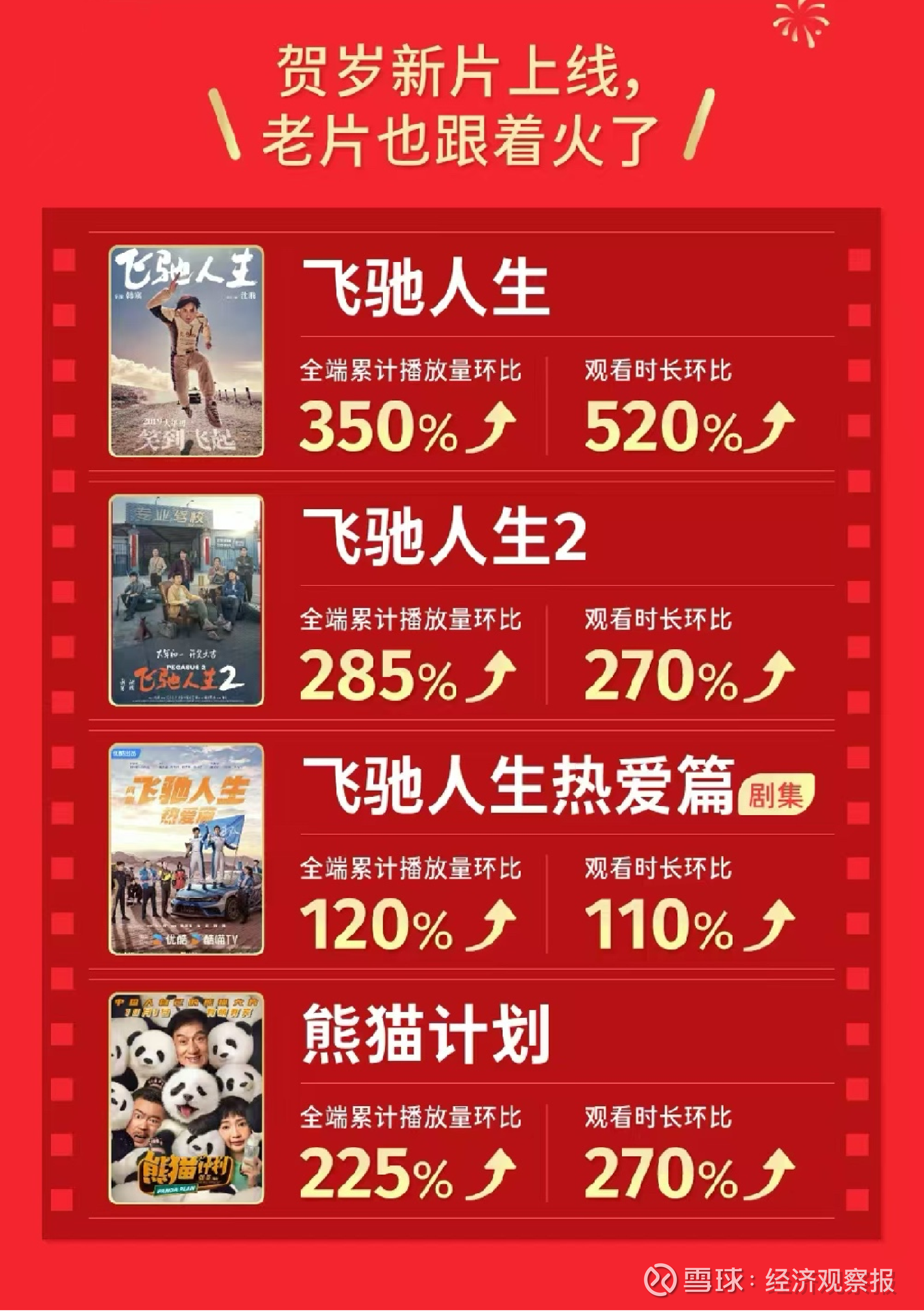 春节档的溢出价值,不仅在线下延展,也显著反哺线上内容热度。虎鲸文娱集团《春节文娱消费报告》指出,新片的集聚效应有效带动经典老片回潮。以《飞驰人生3》为例,其上映后迅速激活“飞驰”IP全系列在优酷平台的观看热情,部分作品增幅超300%。