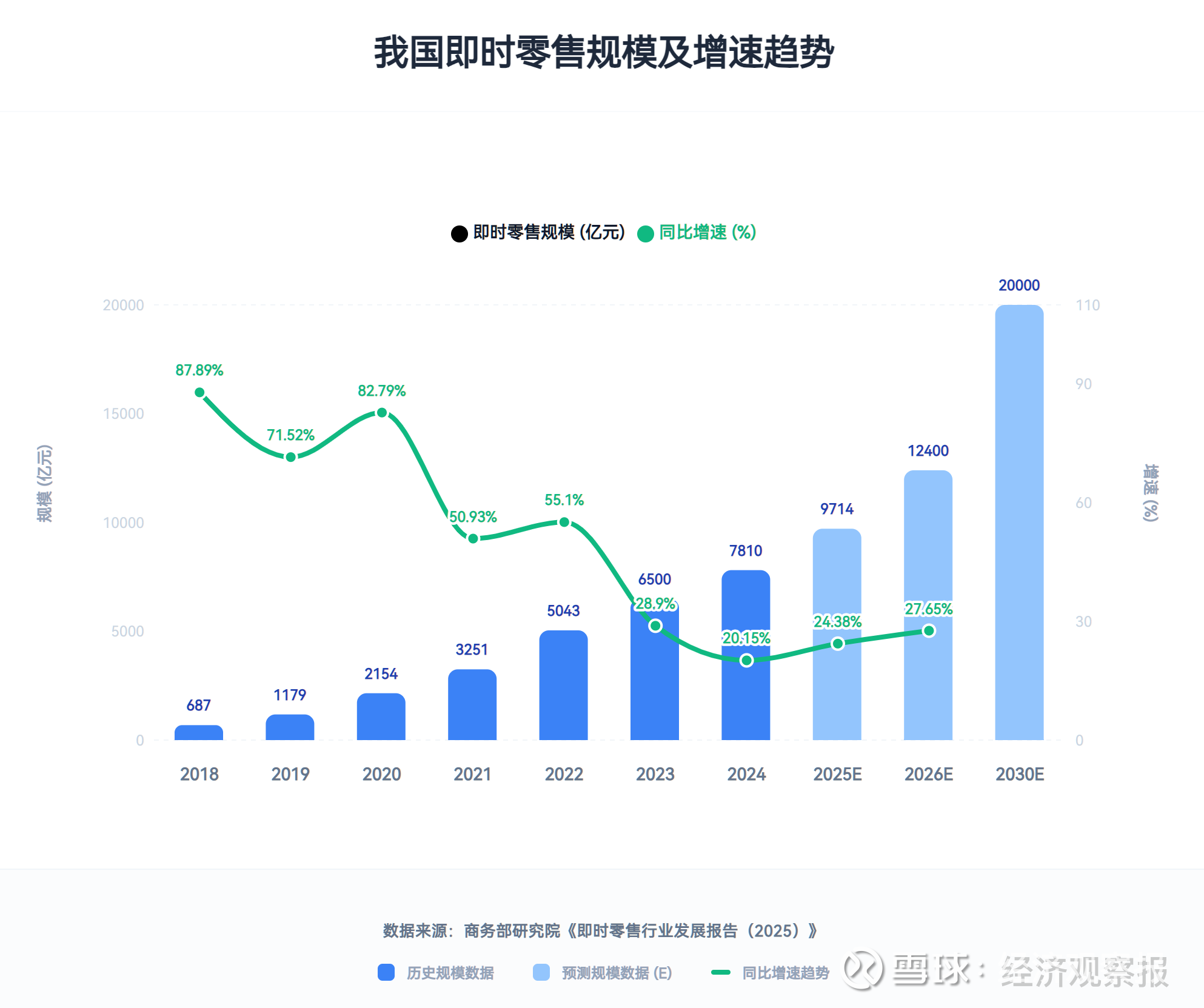 2025年,即时零售迎来高速增长期。商务部研究院的报告显示,预计到2026年即时零售市场规模将突破1万亿元,2030年有望达到2万亿元,“十五五”期间年均增速保持在12.6%,显著高于网络零售与社零整体增速。