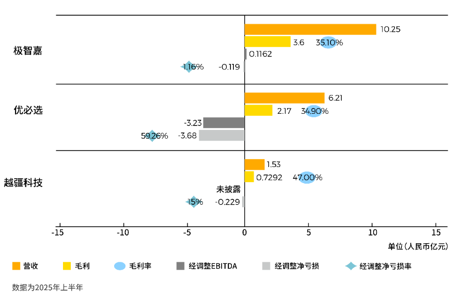 从2025 年中期业绩表现来看,最大的亮点当属港股机器人板块迎来首家经调整EBITDA转正的企业——极智嘉经调整EBITDA转正至1162万元,其经调整净亏损率最低,这意味极智嘉最接近盈利拐点,有望成为最先盈利的港股上市机器人公司。此外,极智嘉还交出了营收毛利双高增的亮眼答卷,营收同比增长31.0%至10.25亿元,毛利同比增长43.1%至人民币3.6亿元,充分印证了公司商业模式成熟度与盈利能力。透过图表不难看出,极智嘉在三家企业中收入规模和毛利最高、经调整净亏损及经调整净亏损率最低,商业化实力在港股机器人板块一路领跑。