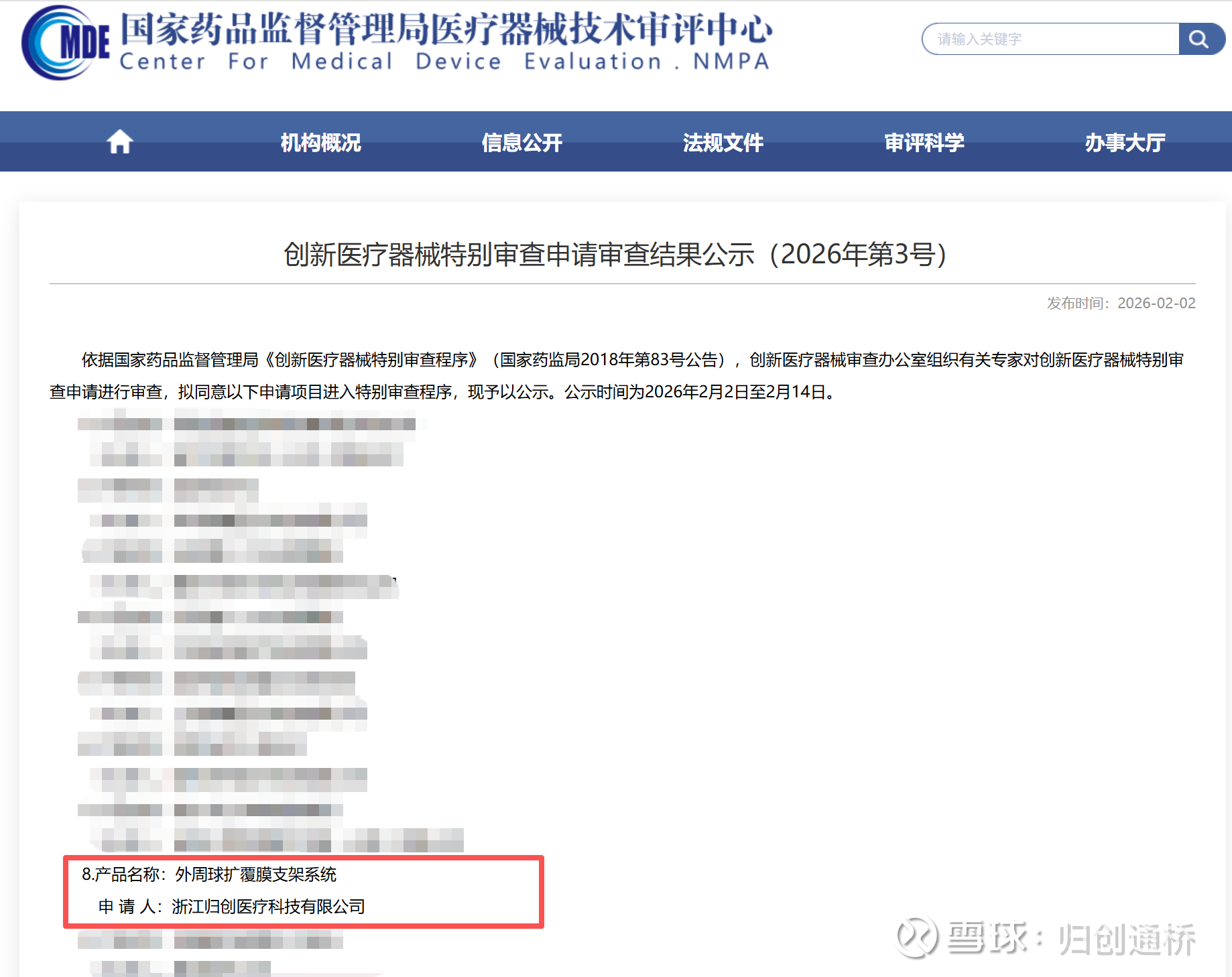 近日,国家药品监督管理局(NMPA)公示了2026年第三批创新医疗器械特别审查申请审查结果。$归创通桥(02190)$ 旗下归创医疗自主研发的“外周球扩覆膜支架系统”产品成功入选,进入特别审查程序(“绿色通道”)。