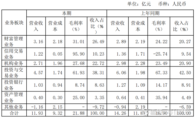 分业务来看,除财富管理业务外,其余5大业务的收入均出现下滑。其中,投资与交易业务实现收入为4.57亿元,同比下滑24.59%;信用交易业务和机构业务的收入也分别减少约0.14亿元和0.27亿元。