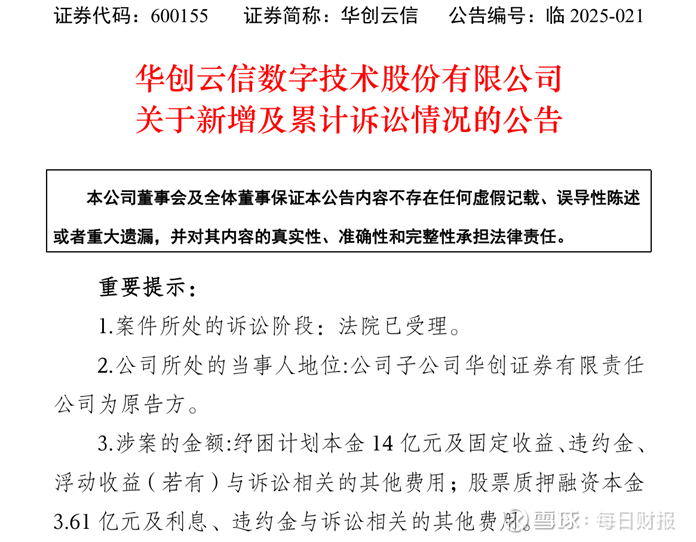 据华创云信披露,华创证券对姜伟等人提起诉讼,要求偿还纾困计划本金14亿元及固定收益、违约金、浮动收益(若有)与诉讼相关的其他费用;股票质押融资本金3.61 亿元及利息、违约金与诉讼相关的其他费用,合计超过17.61亿元。