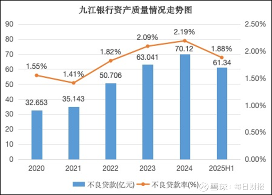 或是意识到业绩增长所遇瓶颈挑战,九江银行已在积极推进风险处置与经营改善。回顾过去五年,九江银行的不良率呈现先升后降的趋势。先是从2020年1.55%增长至2022年的1.82%,而后在2023年与2024年分别进一步增长至2.09%、2.19%,均超过2%。但2025年上半年该行不良率大幅降至1.88%,同时不良贷款总额为61.34亿元,较年初下降12.52%。不良“双降”,显示出九江银行对不良资产处置力度加大以及取得的积极成效。
