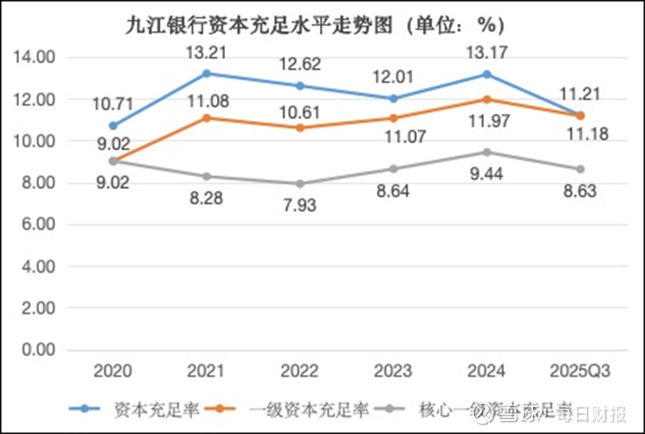 对比来看,九江银行的资本充足水平却呈现波动下滑趋势。2024年末,该行核心一级资本充足率为9.44%,而到2025年6月末已降至8.62%,半年内下降0.82个百分点。2025年第三季度,该指标虽微幅回升至8.63%,但仍明显低于行业平均水平。