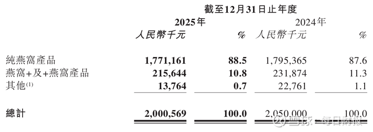 2025年,燕之屋旗下各类产品收入均有所减少。其中,传统的纯燕窝产品销售收入占比达到88.5%,燕窝+及+燕窝产品销售收入占比10.8%。燕之屋的新产品归入“其他”类型,销售收入占比仅为0.7%。