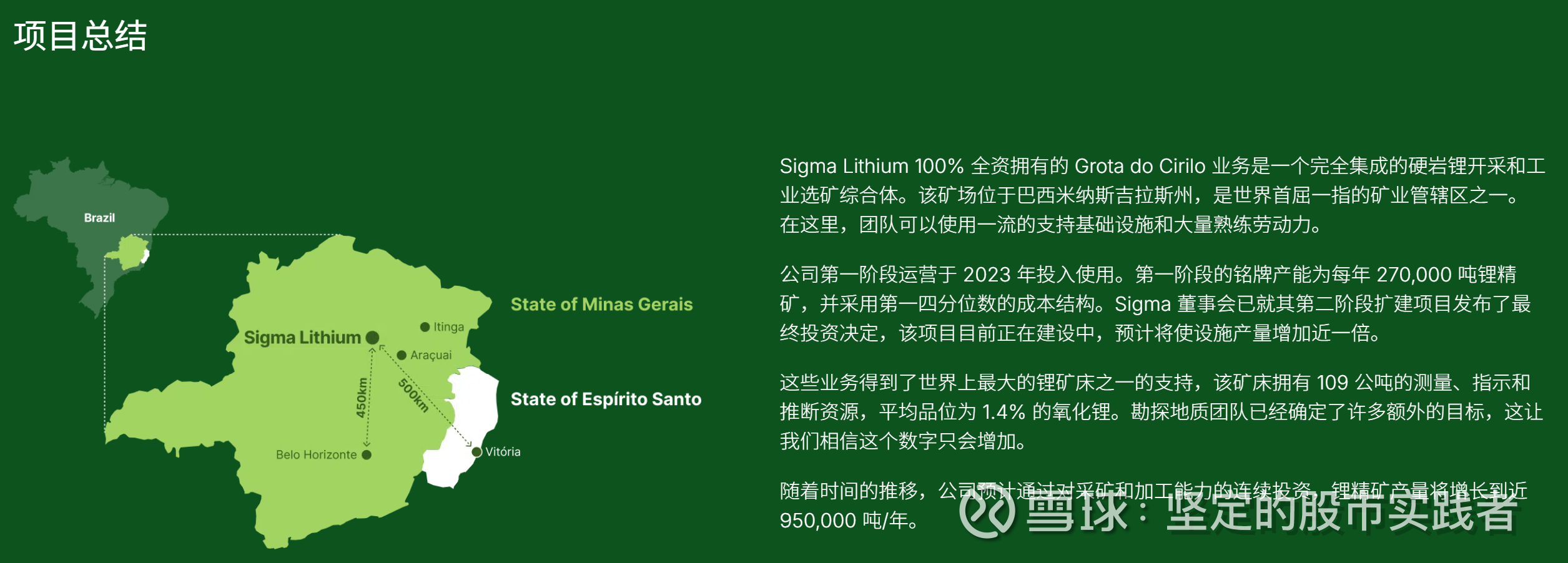 SGML资产位于巴西Minas Gerais州东北部的Araçuaí and Itinga,距Araçuaí以东约25公里,距州首府Belo Horizonte东北方向约600公里。该项目距离Port of Vitoria约700公里,公司通过该港口将精矿运往全球市场。公司通过其全资子公司Sigma Mineração S.A.("Sigma Brazil")间接持有运营资产100%的所有权,租赁区域由29项矿权组成(包括采矿特许权、采矿特许权申请、勘探授权、矿产勘探授权申请),分布在183平方公里的范围内,位于Sigma Brazil持有的更广阔的18,277.91公顷土地包内。Sigma的矿产特许权包括四个矿区:Grota do Cirilo(项目第一阶段、第二阶段和第三阶段所在的区域)、Sao Jose矿区、Genipapo矿区和Santa Clara矿区。