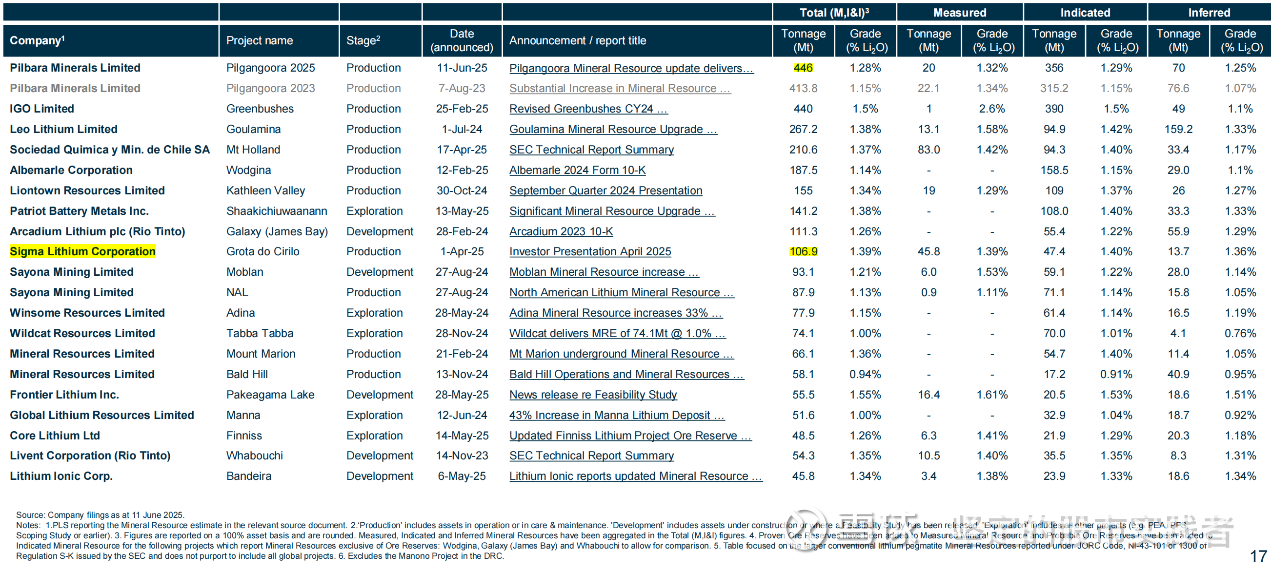 随着2024年勘探活动的推进及地下资源进一步优化,Grota do Cirilo项目全球资源总量确认达1.1亿吨,氧化锂(Li2O)平均品位1.46%(探明+控制+推断级)。较2024年5月8日公布的先前预估(1.086亿吨,1.43% Li2O)有所提升。扣除第一阶段已开采的310万吨(探明+控制+推断级)资源后,项目当前保有总资源量为1.069亿吨,Li2O平均品位1.38%(10690*1.38%*2.47=364万吨LCE),充分保障了矿产资产的长期开发价值。