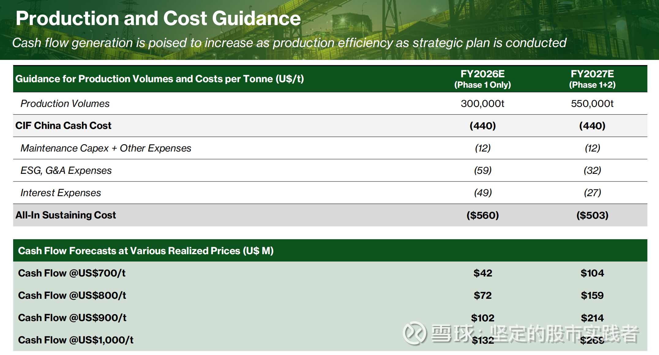 直接上公司给的指引,1000美金锂精矿价格,26年、27年产量分别30万吨、55万吨情况下,自由现金流分别1.32、2.69亿美金。今天,锂精矿价格已经超过1000美金。