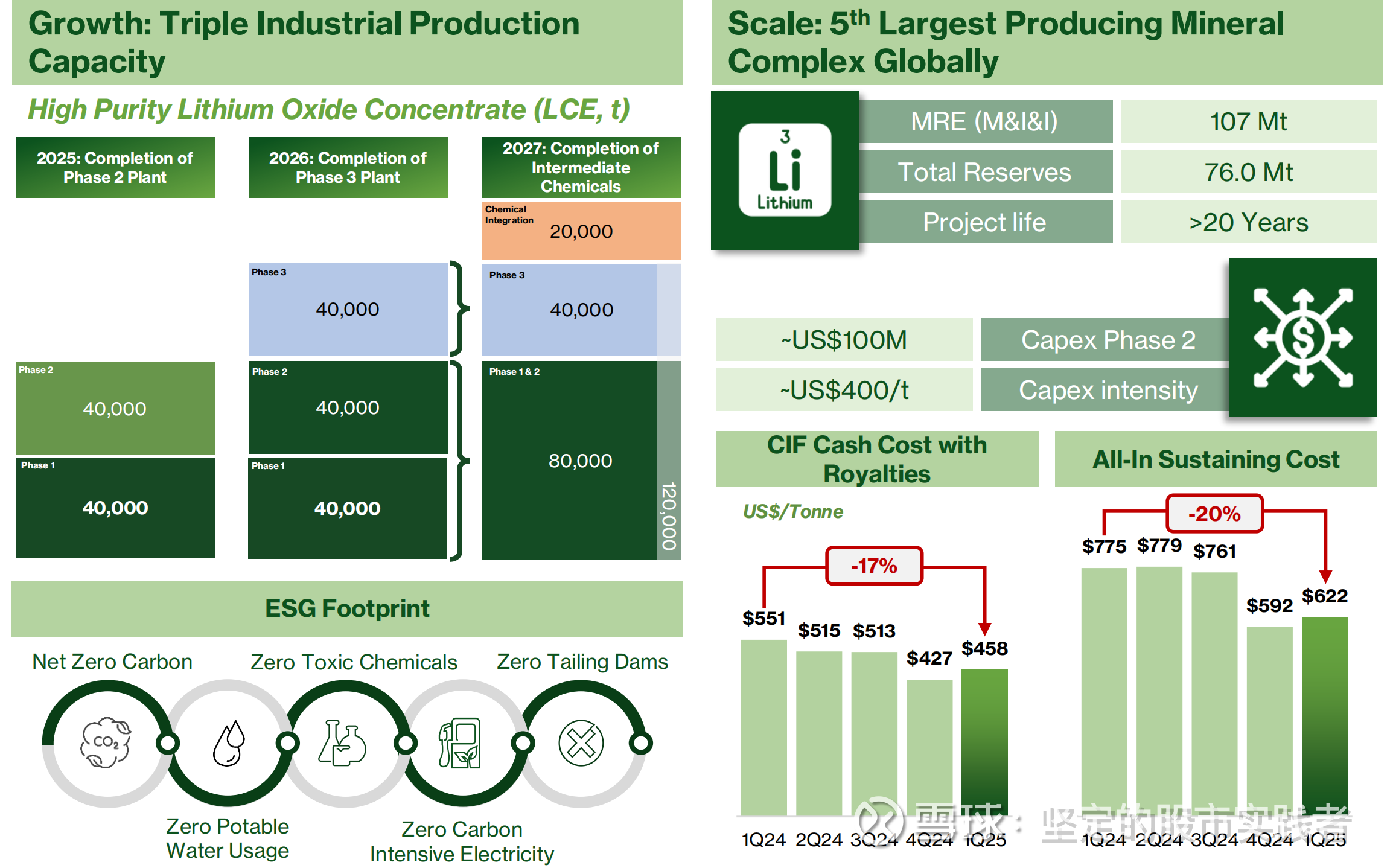 目前公司一期4万吨LCE当量已经于23年投产,计划的二期4万吨LCE当量本来25年底投产,现在因为资金障碍和生产调整,最新的三季报电话会议指引26年底二期投产,之后会上三期4万吨LCE。这样总共可达12万吨LCE。比较下,目前天齐锂业、赣锋锂业也不过8~10万吨权益LCE当量。