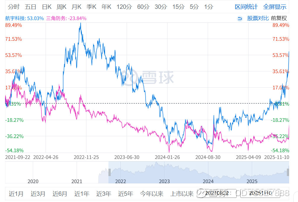 三角和航宇很像。他们两个都是军工,军转民概念。大客户航宇差不多35-40%航空动力,三角接近80%。 三角主要给军工,航宇是更多民航,他们两个都没逃过24年这一波军工订单下滑,基本上从23年下半年到25年年中就是一直在下滑,最近才有一个走稳重新增长的态势,具体知道原因的朋友请评论一下为什么?我猜测是因为机型调整,加上疫情后可能有一些波动。