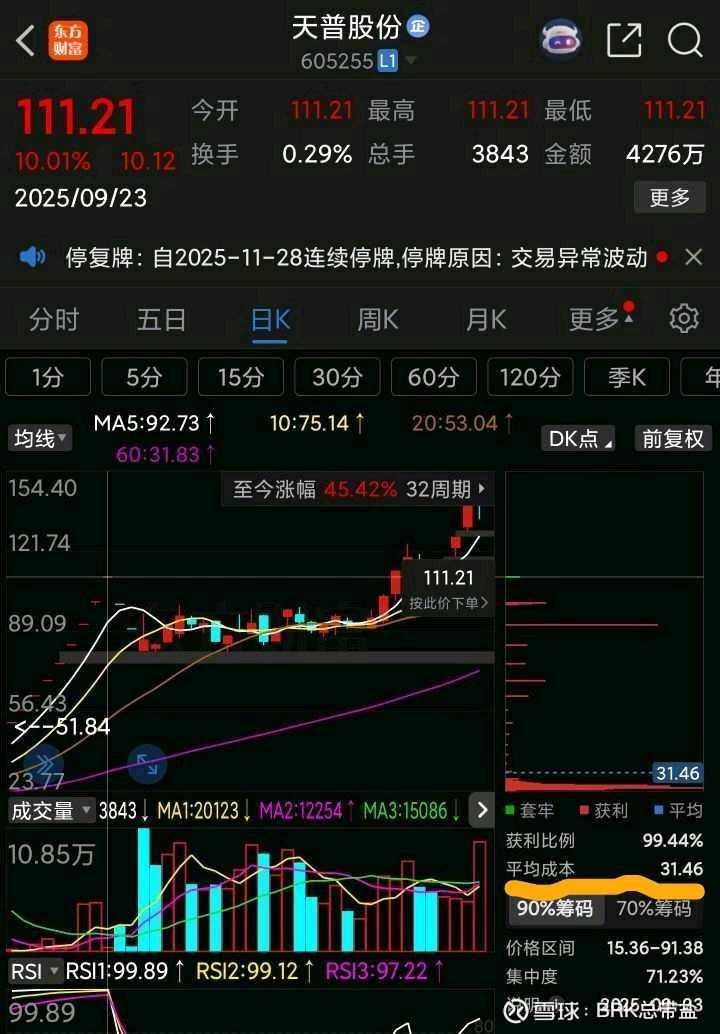 9月23号,市场平均成本是31.46元,正值天普三进宫,之后连续三个跌停。
