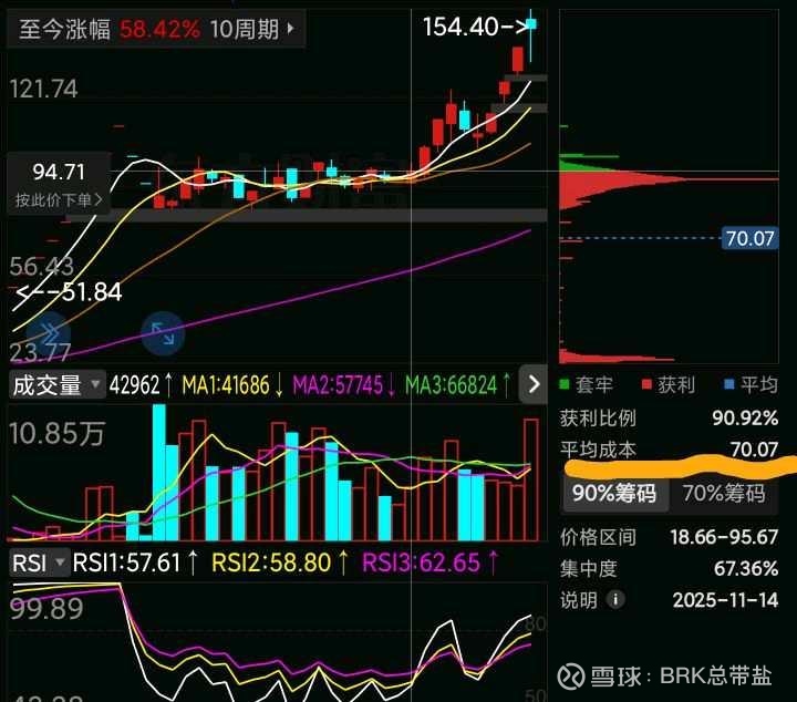 经过将近两个月的箱体震荡洗盘,前期底部的获利筹码被洗掉大部分,市场平均成本抬高到了70.07元,主力开始二波三浪的拉升。