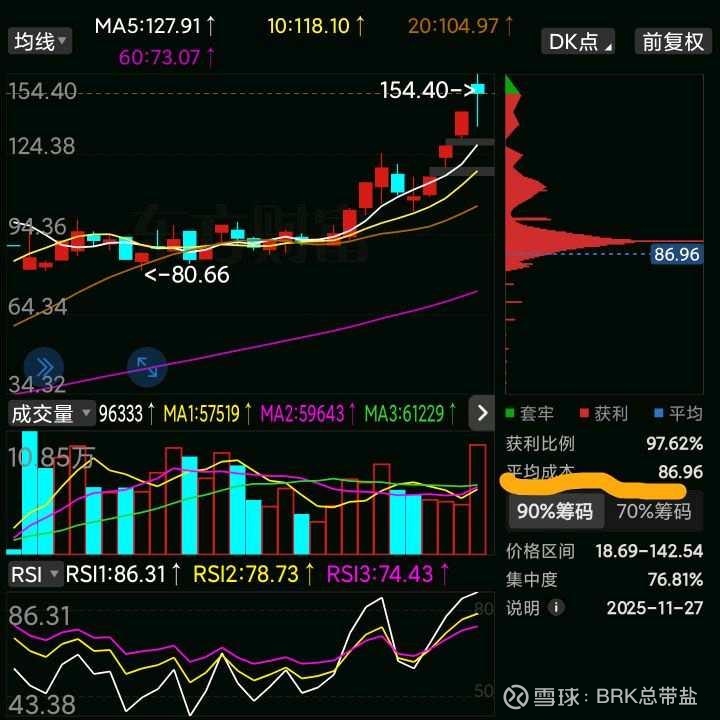 这次拉升从箱体中轨95元左右的位置拉高了50%左右到了147元,这个位置恰好是空中加油的位置,为什么呢?这个时候市场平均成本是86.96,是收盘价147元的59%,也就是说,车上的朋友平均有40%多的收益率,这给接下来的拉升带来了巨大的不确定性,非常有必要再次洗盘。