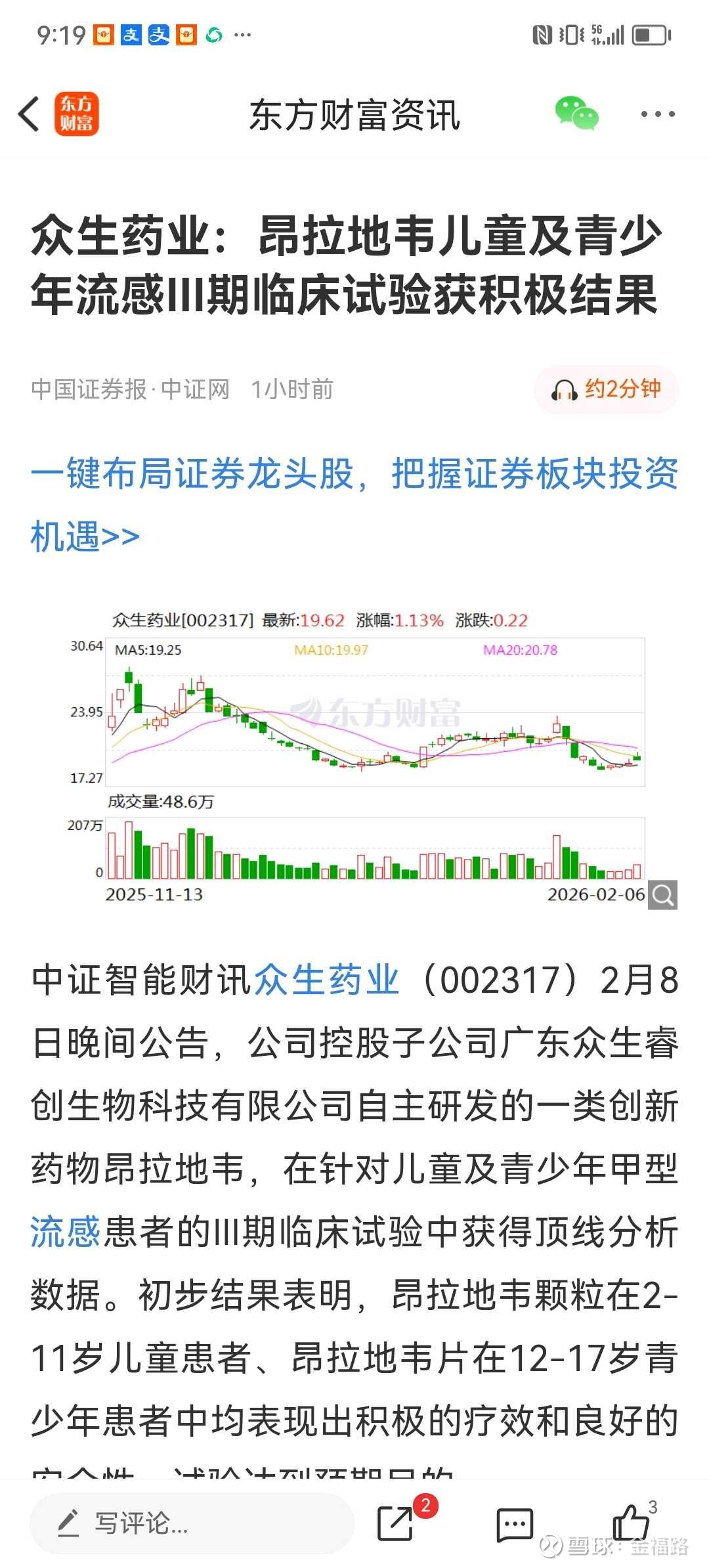 众生今天又出利好消息,昂拉地韦儿童及青少年流感III期临床试验获积极结果,后面就是申请上市,再后面就是进医保。到今年底流感暴发,就这一款药就能给公司贡献不少的利润。就这一个利好其实也值几个涨停!东财人气显示,众生的人生又进入前200名了,估计到明天就又上100名了。