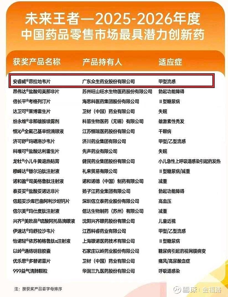 2026年3月25日,第十一届健康商品交易大会(2026西鼎会)在浙江湖州隆重举行。公司自主研发的治疗甲型流感的一类创新药——安睿威®昂拉地韦片,凭借其在抗流感领域的突破性创新与广阔市场潜力,荣获“未来王者——2025-2026年度中国药品零售市场最具潜力创新药”奖项。网页链接