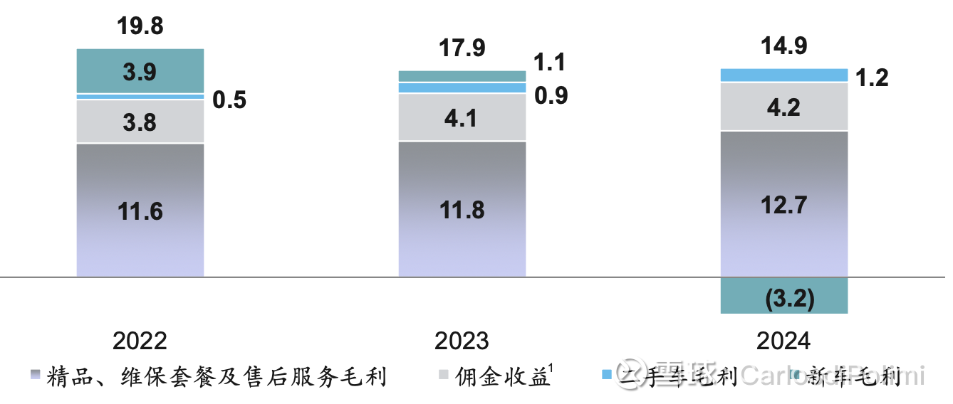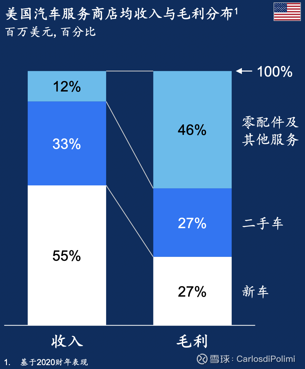 经销商的营收大头来自卖车,对于中国的上市公司来说,主要以新车为主,而美国,则是新车、二手车并重。而从毛利来看,中国的经销商则基本依赖卖车带来的保险、贷款等金融业务以及最重要的售后业务。