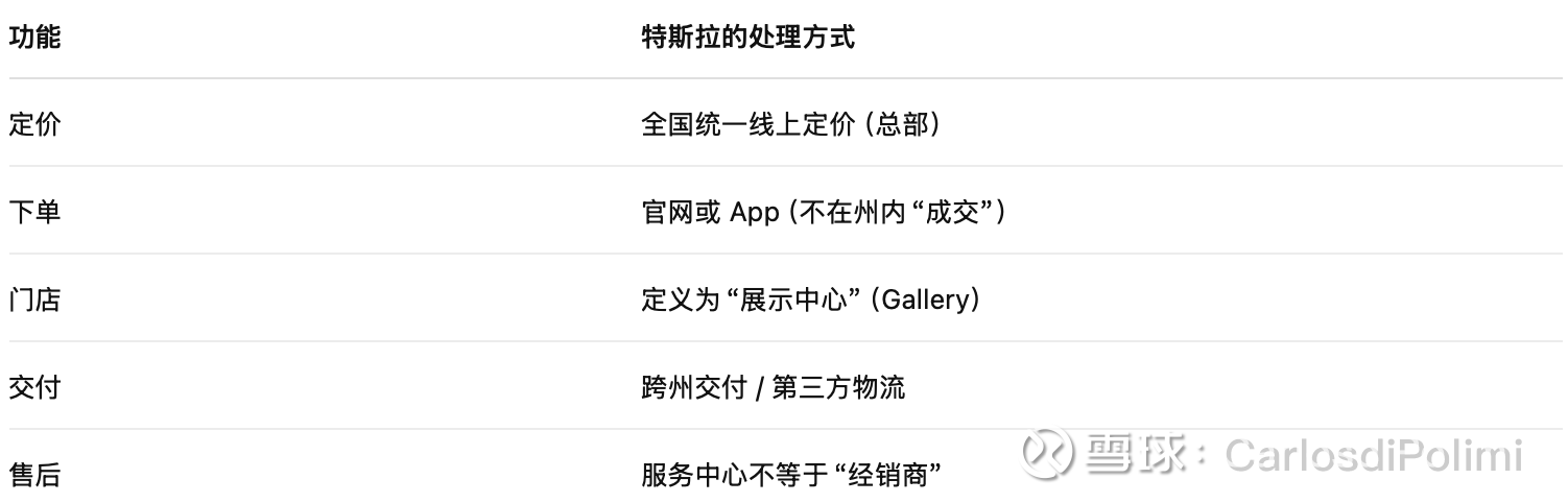 法律假设:制造商 先授权了经销商 → 然后可能“背叛”经销商 → 因此要立法限制制造商但特斯拉的现实是:从未授权任何经销商