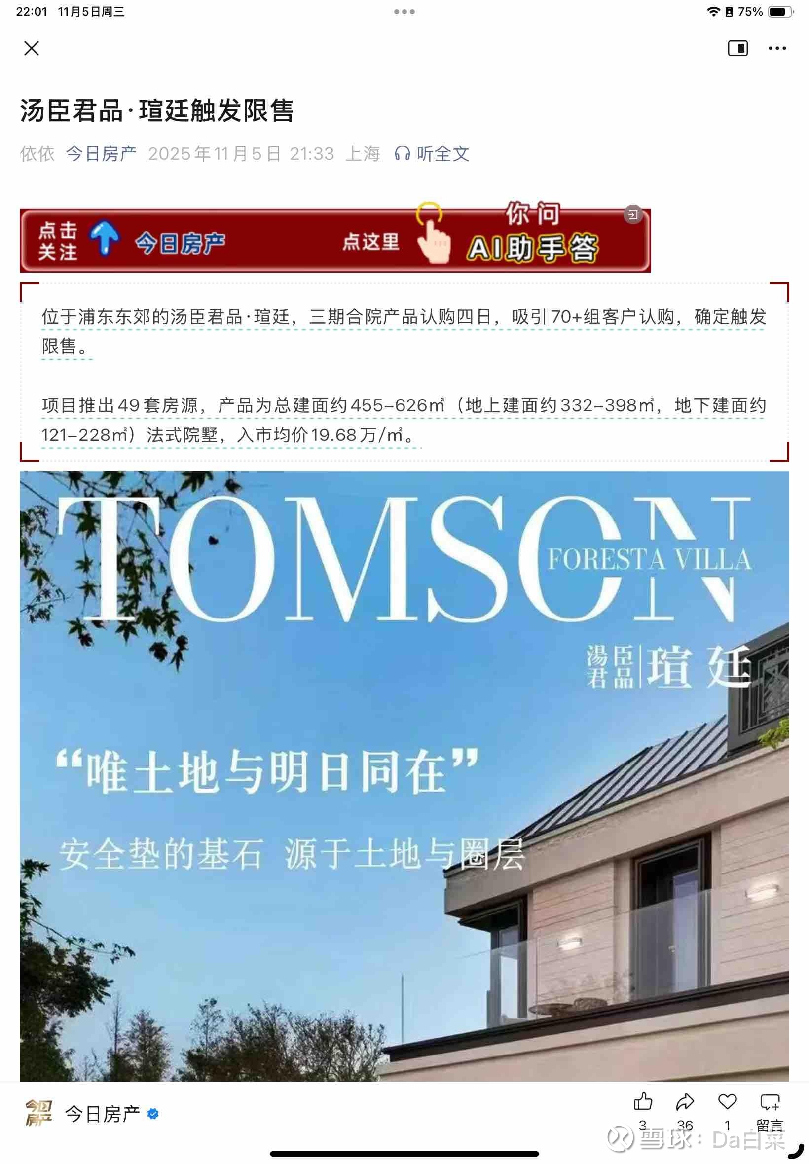 现在的市场上单价近二十万的豪宅,触发限售的凤毛麟角,老钱汤臣自带光环。地段稀缺、品牌上乘、产品出众,定价包括价差均衡,被高端客群青睐是自然而然的。这样看,接下去大面积的六郡和沿河的三四十幢独栋,也会是畅销货。$汤臣集团(00258)$
