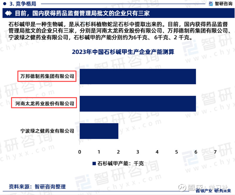 石杉碱甲是一种生物碱,是从石杉科植物蛇足石杉中提取出来的。目前,国内获得药品监督管理局批文的企业只有三家,分别是河南太龙药业股份有限公司、万邦德制药集团有限公司、宁波绿之健药业有限公司,石杉碱甲的产能分别约为6千克、 6千克、2 千克。$万邦德(SZ002082)$ $太龙药业(SH600222)$ $灵康药业(SH603669)$