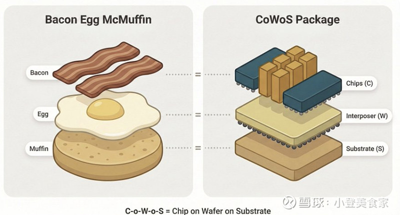 底下的面包片是基板(Substrate),负责供电、对外连接、物理支撑。上面的培根是芯片,GPU、HBM这些。中间夹的那层鸡蛋是中介层(Interposer),负责芯片之间的高速互联。这就是台积电的CoWoS:Chip-on-Wafer-on-Substrate,名字就是结构。