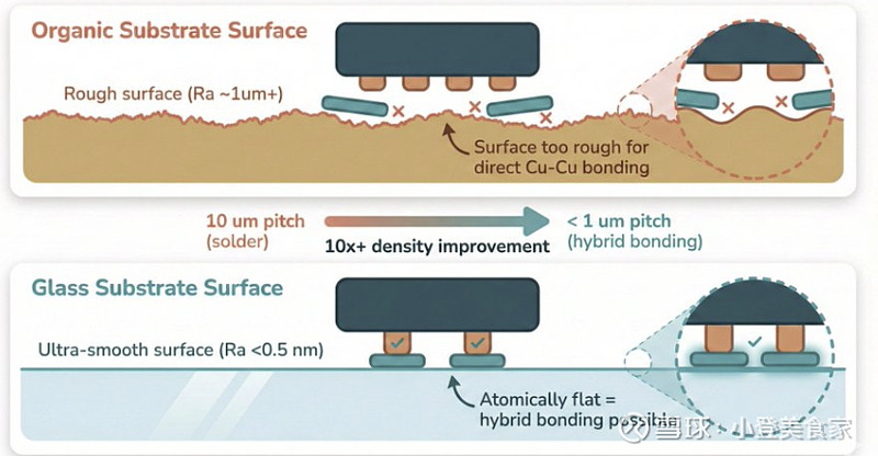 表面极其光滑,有机基板表面是土路,玻璃表面是溜冰场。混合键合(Hybrid Bonding)这种直接把铜面对面压在一起的技术,需要的就是这种光滑度。连接间距可以从几十微米压到10微米以下,同样面积的连接数翻几十倍,有机基板做不到,玻璃做得到。2.透明,光可以穿过去。这意味着光波导可以直接做在基板里面,电信号变光信号在芯片之间传输,光互联的舞台从芯片表面延伸到了基板内部。
