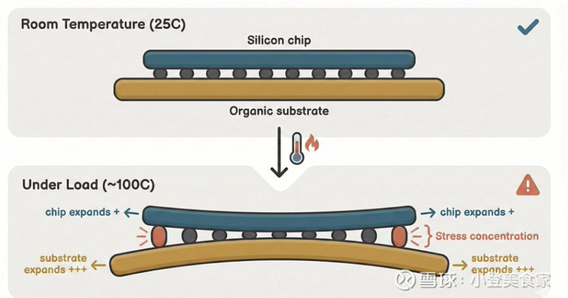 第一科:热胀冷缩。硅的热膨胀系数大约3 ppm/°C,有机基板17-20 ppm/°C,差了六七倍。封装小的时候无所谓,AI芯片那种大封装一加热,基板跟芯片朝不同方向拱起来,焊点直接裂开。