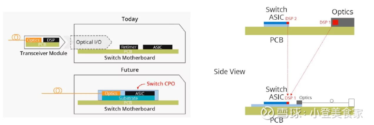 CPO把光引擎直接封装在交换ASIC旁边,共用一块基板,电信号只跑几毫米就到光电转换界面,那截铜线的损耗从根本上没了。