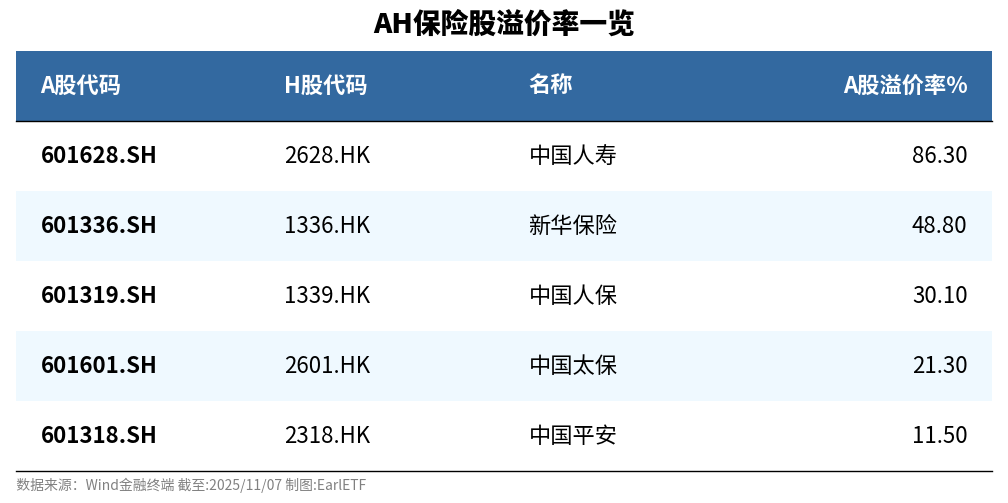 下表是几只AH股保险股的A股溢价率,中国人寿高达86.3%,新华保险也有48.8%,都属于比较高的水平。