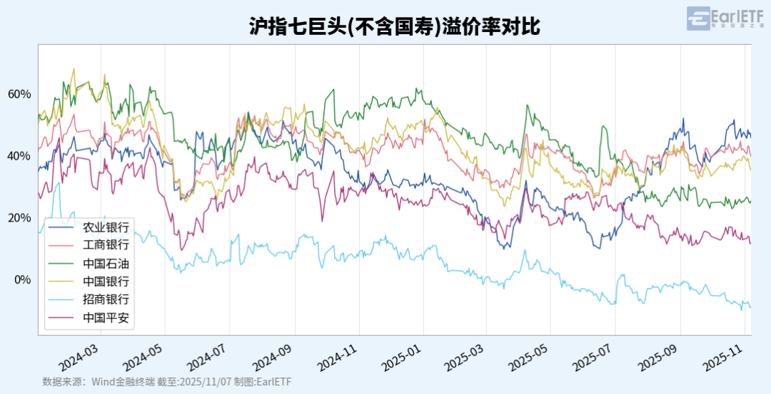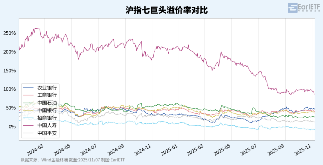 除了这张图,我有时候还会分享具体成分股的溢价率,如下图。不过也有读者问过,说是七巨头,为什么要剔除中国人寿?