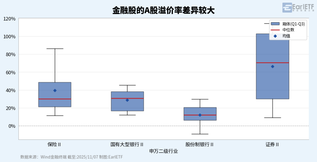 为了探究不同行业在H股市场的折价程度,我以截至11月7日所有同步在A股和H股上市的金融股,根据申万二级行业分类,绘制了一个A股溢价率的箱型图。一共包括保险、国有大型银行、股份制银行和证券四个二级行业。