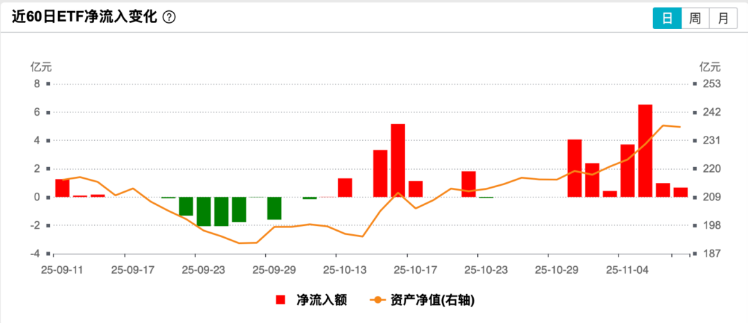 下表是过去60个交易日的ETF净流入,可以看到从10月中开始,就出现了持续的净流入,ETF规模也从不足200亿元跃升至当下的水平,可见近期市场对港股通非银指数的暴露,很是渴求。