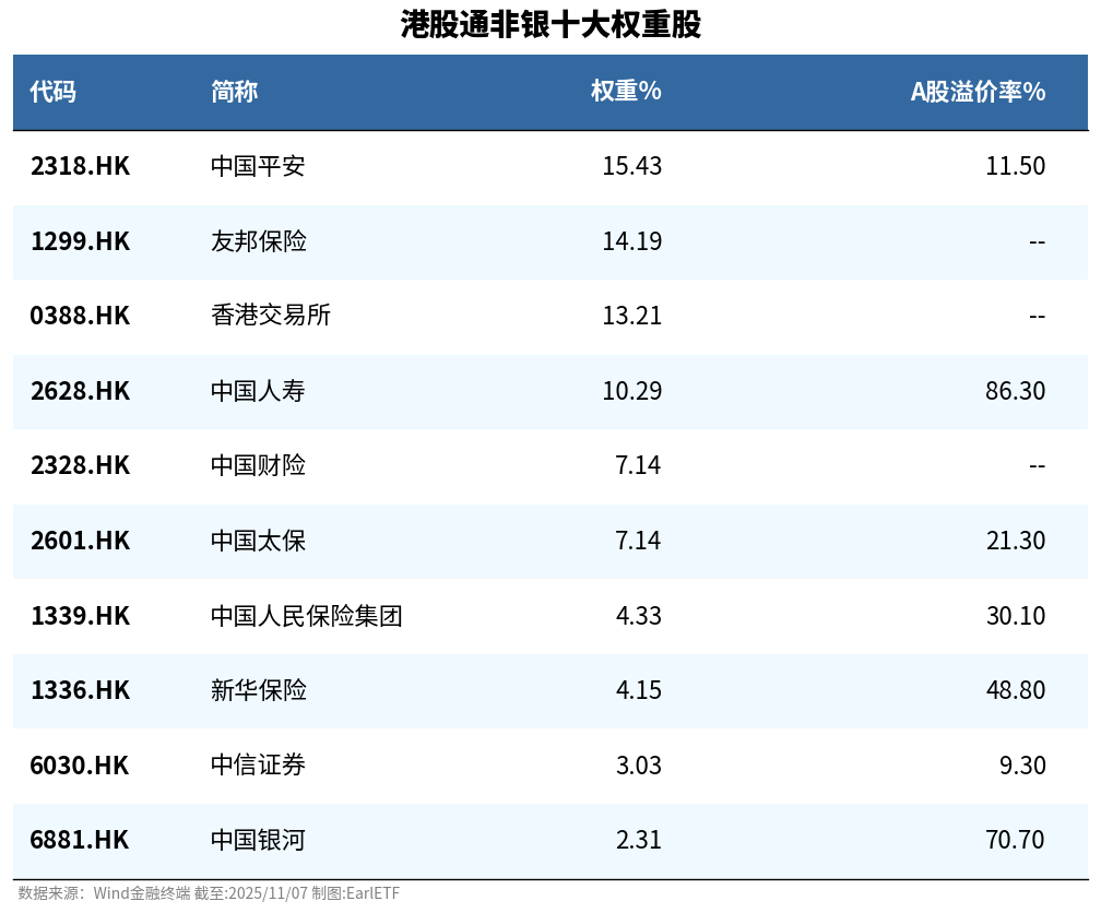 下表是这个指数最新十大权重股,如果是AH股,我还加上了A股溢价率数据。从表中可以看到,港股通非银是一个以保险为核心的指数,保险股的权重合计67.14%。