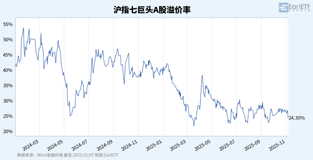 所以我基于上证指数前七大AH股,用同样的算法拟合了一张,这是截至11月7日的最新数据,总体24.3%的溢价,依然处于今年以来的低点。