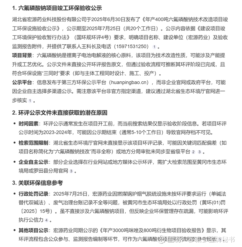 中氟欣材:2023年5月5日,进行了环境影响评价第一次公示,公开征求公众意见,2025年1月10日,三明市生态环境局再次公示拟审批意见,确认项目符合规划环评要求,并已完成公众参与程序。截至2025年8月4日,该项目已进入土建阶段,主要设备开始定制。2025年8月,公司披露5000吨六氟磷酸钠项目仍在实施中,但未涉及招标环节。