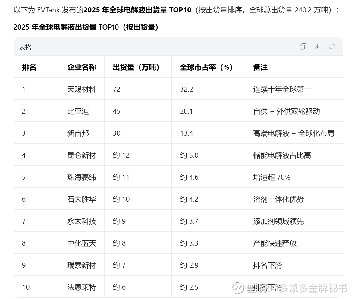 按照媒体的统计,2025年十大电解液厂家排名(按出货量排名)
