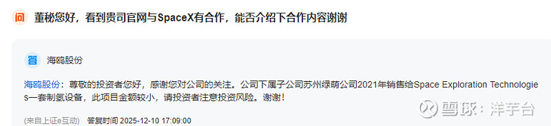 【SpaceX】——子公司苏州绿萌公司向Space X销售制氢设备,