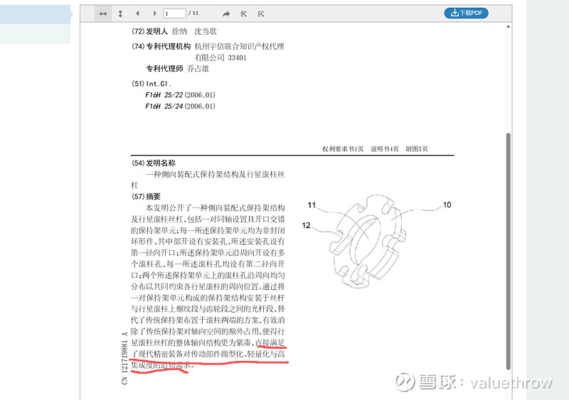 子公司杭州玖月捌传动科技有限公司申请的“一种侧向装配式保持架结构及行星滚柱丝杠”专利已公布,请教一下,这里面的精密装备涉及哪些,这个专利水平如何