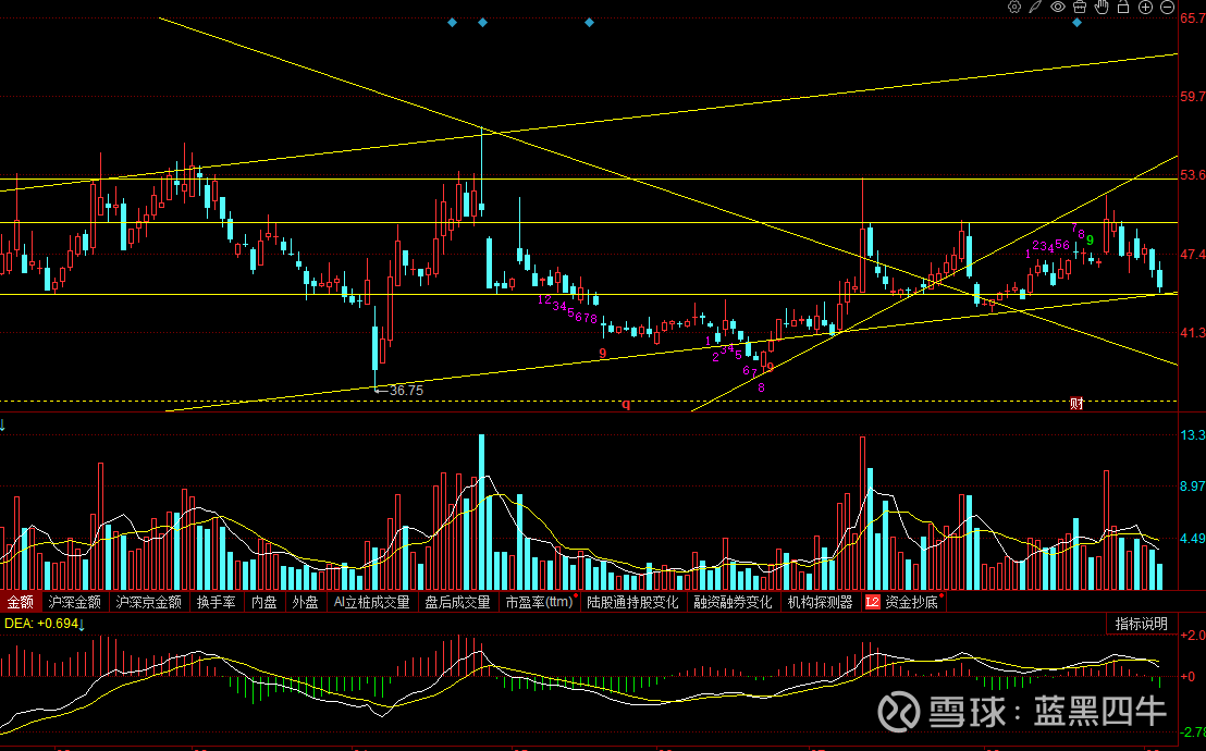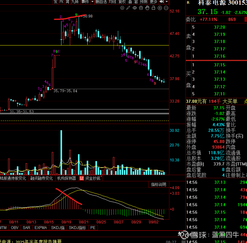 技术面看,创新高60min顶背离且收阴线,这是对市场敏感投资者的第一减仓点,当然这有可能错有可能是试盘,但减仓没毛病,接下来在平台震荡过程中diff和dea线都是明显下移的,这说明资金已经在出货,更要提高警觉,接下来九月马上到了,如果你能意识到我说的九月的风险,那么破平台的第一时间就是清仓点,这个点其实非常清晰,跳空低开破平台,反抽站不上,这已经没法再明显了。下一根K线是最后的逃命点,又给了你最后一次反抽不过的确认K。
