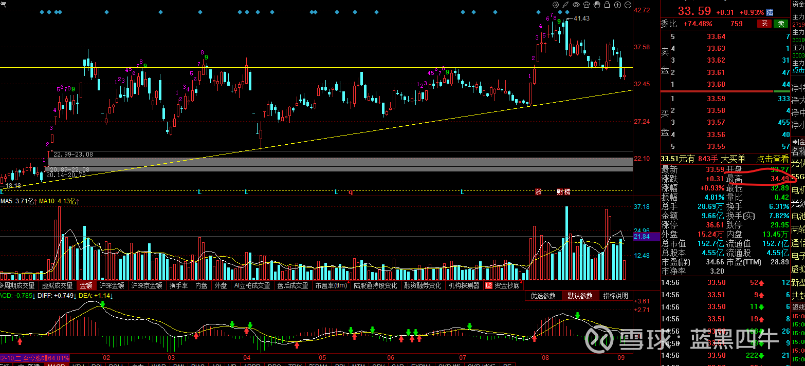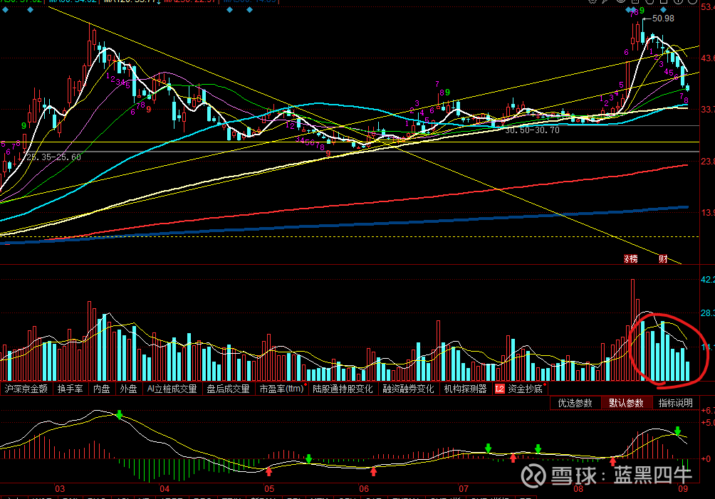 是不是缩量反抽,最高价34.49,和我说的差了1毛钱。如果在高点止损,相当于前天那根近9个点的大阴线回来了小一半。34.6这个平台原来是大支撑,一旦破了就变成大压力。前天放量跌,昨天缩量涨,能涨上的可能性很小。如果你能对昨天大盘若反抽有预期,在对个股的支撑压力了解,那么错过了黄金逃命点,市场也可能会给你一个稍纵即逝的补救机会。退一步讲,如果行情来了,你也看好这个标的,等站稳34.6你再接回也不赔钱啊,但这可以保住这个票往下砸你的本金。这就是防守的意义