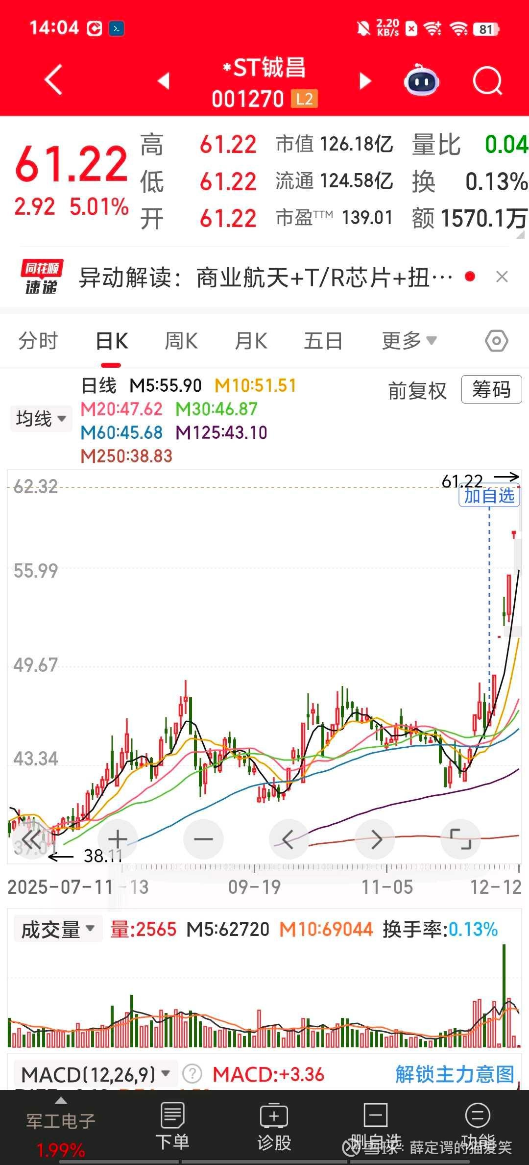 事到如今,我也确实相信自己还有很多漏洞。比如控制出手,前天空仓本来是想看昨天的嘉澳环保的,结果嘉澳跌停封死了,我又开始心痒了,临时起意去买永鼎……其实我不是没关注商业航天,只是前排的不愿意追高,后排的又不想去,比如铖昌,还有很多类似的机会都没去尝试。