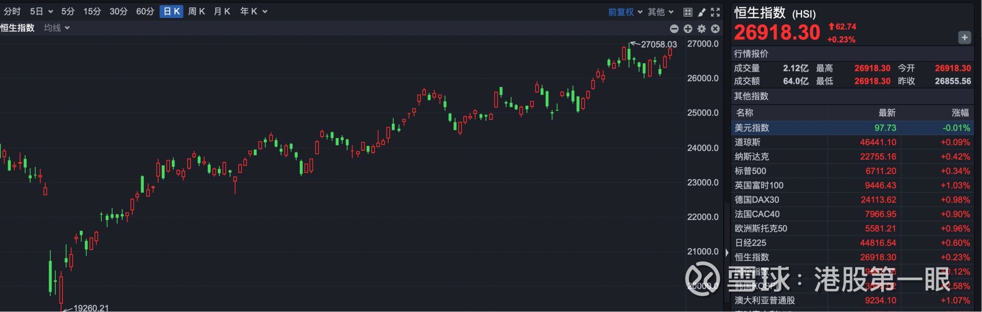 今日(10月2日)是国庆节第二天,港股市场恢复交易,港股早盘小幅高开。截至发稿,恒生指数开盘报26918点,上涨62点,涨幅0.23%;恒生科技指数报6483点,上涨17点,涨幅0.27%。