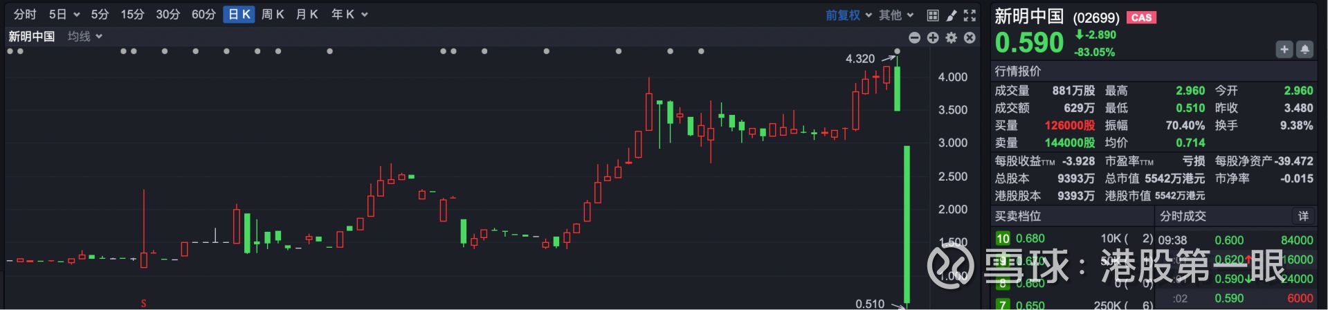 此外,又见公司股价暴跌。今日早间,新明中国(02699.HK)下跌超80%,股价最低报0.51港元,大跌之后该公司市值已低于6000万港元。9月30日,公司公布中期业绩亏损1.37亿元,上年同期亏3.35亿元。