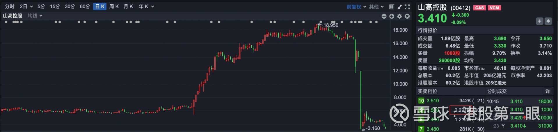 今年5月下旬开始,山高控股股价大幅上涨,从6港元起步,最高涨到18.95港元。不过,9月16日,山高控股单日下跌24%,9月19日再次大跌75%,10月9日再度大跌19%,今日盘中跌幅超过8%,目前股价已经跌回到3.4港元附近,目前市值约206亿港元。