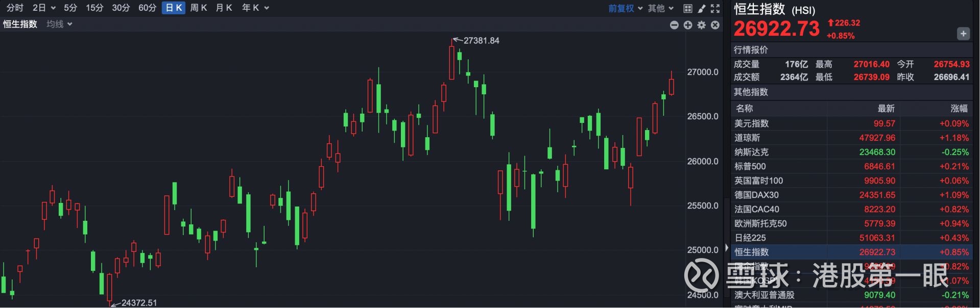 截至收盘,恒指报收于26922.73点,上涨226.32点,涨幅0.85%。
