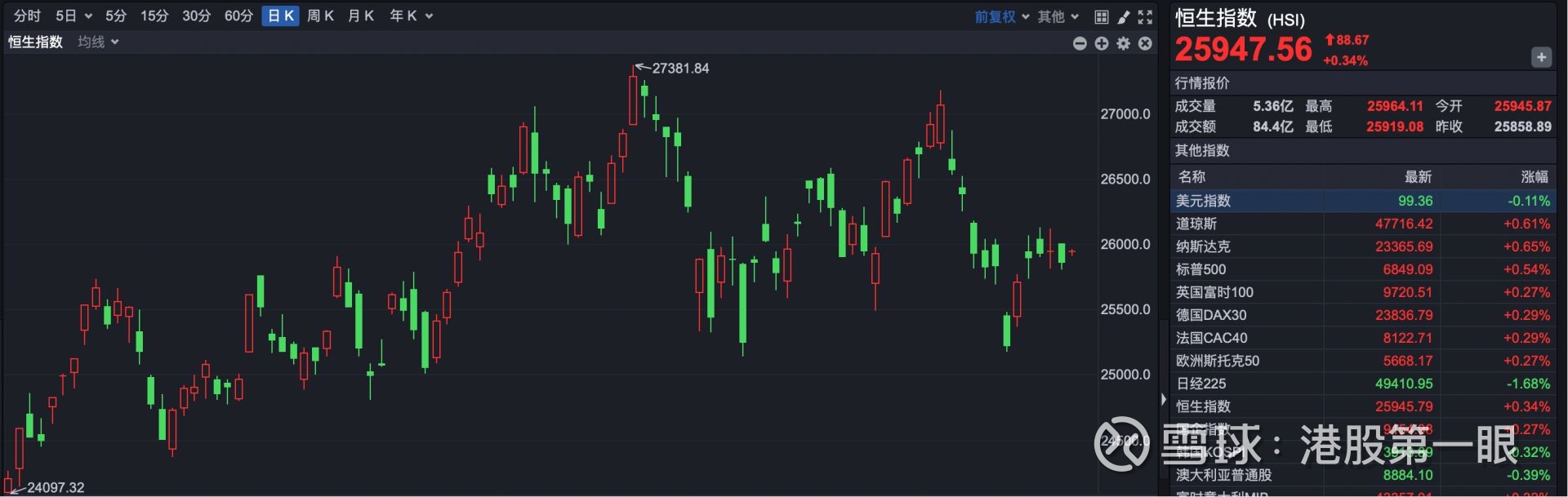 截至发稿,恒生指数报25945.87点,上涨86.98点,涨幅0.34%。