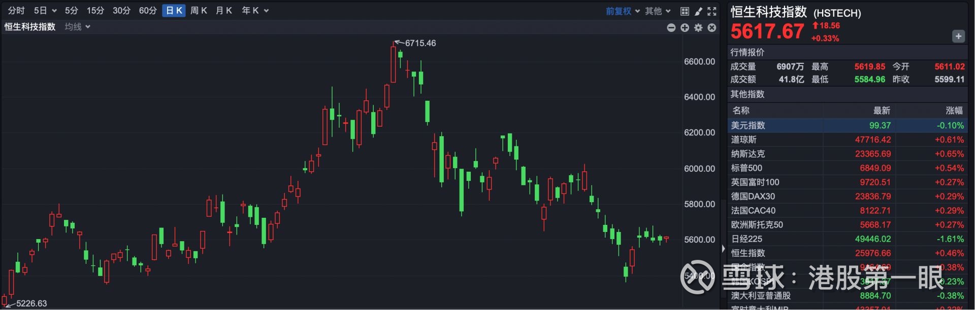 恒生科技指数高开0.21%,截至发稿报5617.67点,涨幅0.33%。